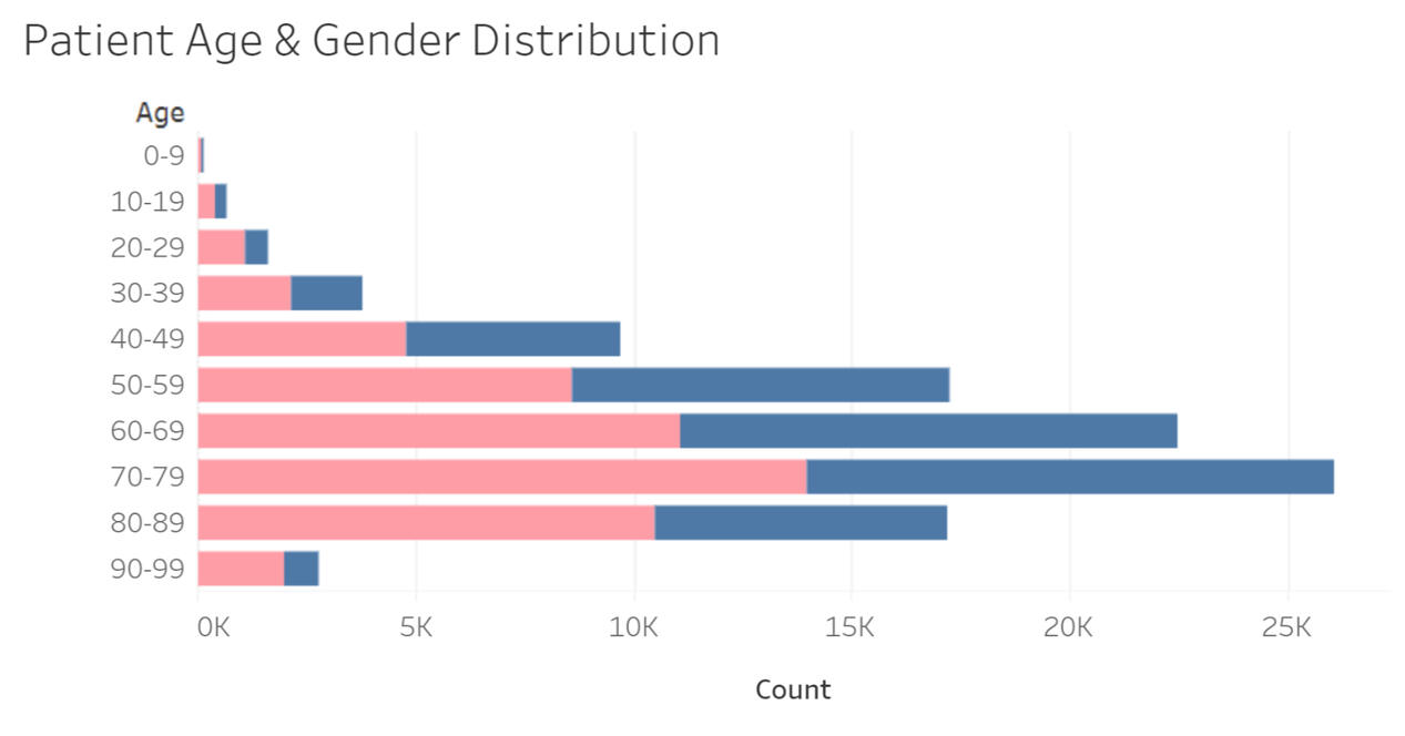 The majority of the patients were female, and the most common age range was 70-79, with a total of 26,068 encounters listed in this group.