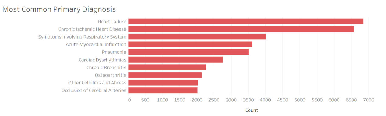 Prior to analysis, it was ensured that there are no null values in the columns of the data set that were used. The top 10 most common primary diagnoses have been renamed from their ICD-9 code in the data set to their full diagnosis name for clarity.Analysis