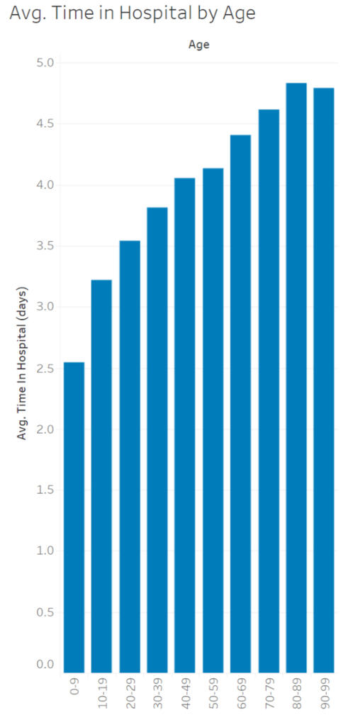 As you can see below, the average length of hospital stay gradually increases as we progress through the age “bins,” with a slight decrease of .038 days in the average occurring between the bins for 80-89 and 90-100.