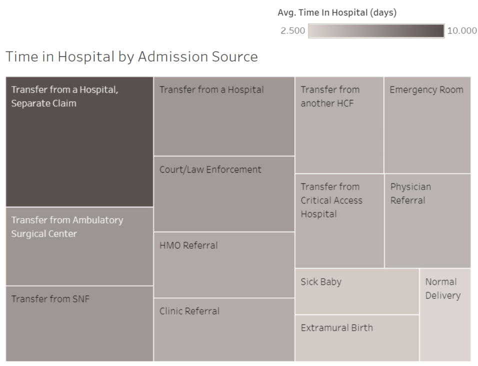 Our next question addresses which admission sources have the longest stays. The treemap helps us compare visit lengths of births, ER transfers, and more. Shown by the size and shade of the block, transfers from other hospitals have the longest stay duration. Normal births have the shortest length of stay.