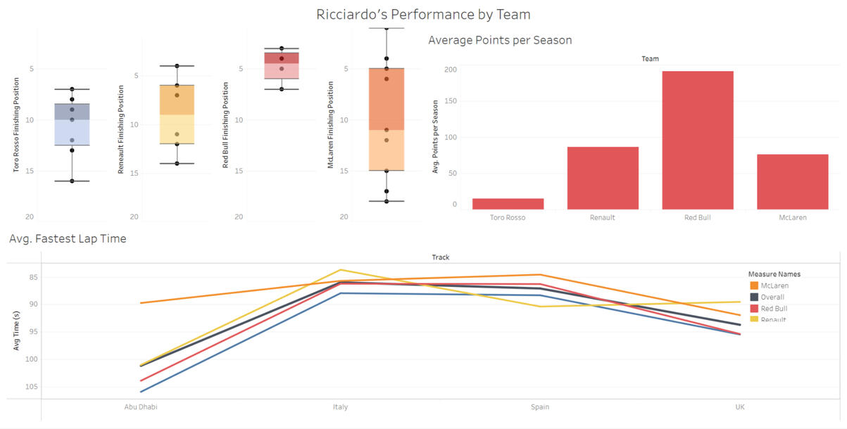 Performed exploratory analysis of 10 years of data on four race tracks to examine how Ricciardo’s performance varied based on Formula 1 team. Visit my Tableau page to interact with the data visualizations!